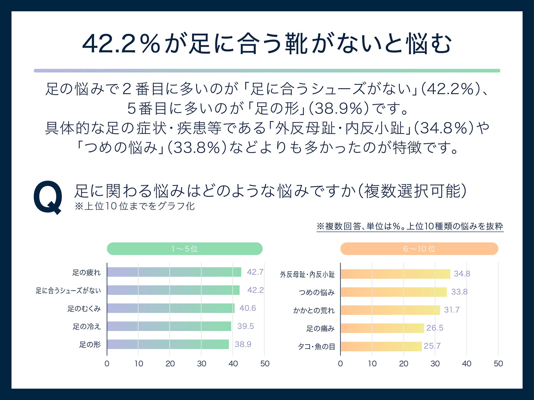 ビジネスシーンでもプライベートシーンでも、ほぼ毎日、シューズを履く生活をしていますが、具体的な症状よりも、世代を問わず「足に合うシューズがない」ことに悩んでいたり、「足の形」に悩んだりしていることが分かりました。