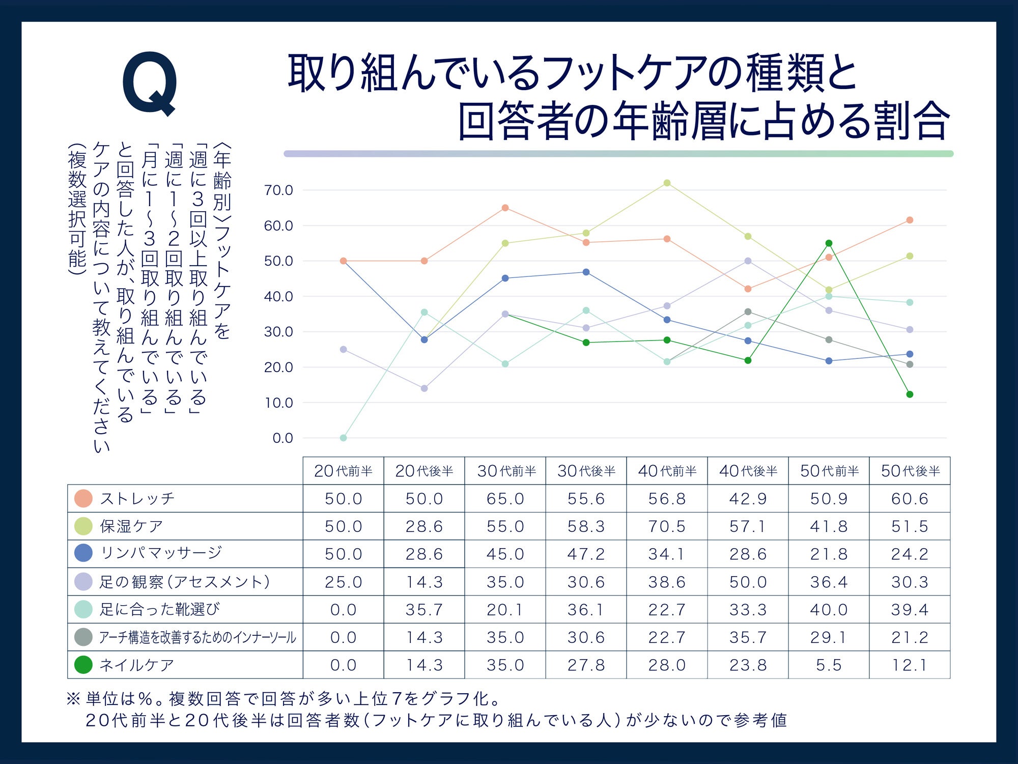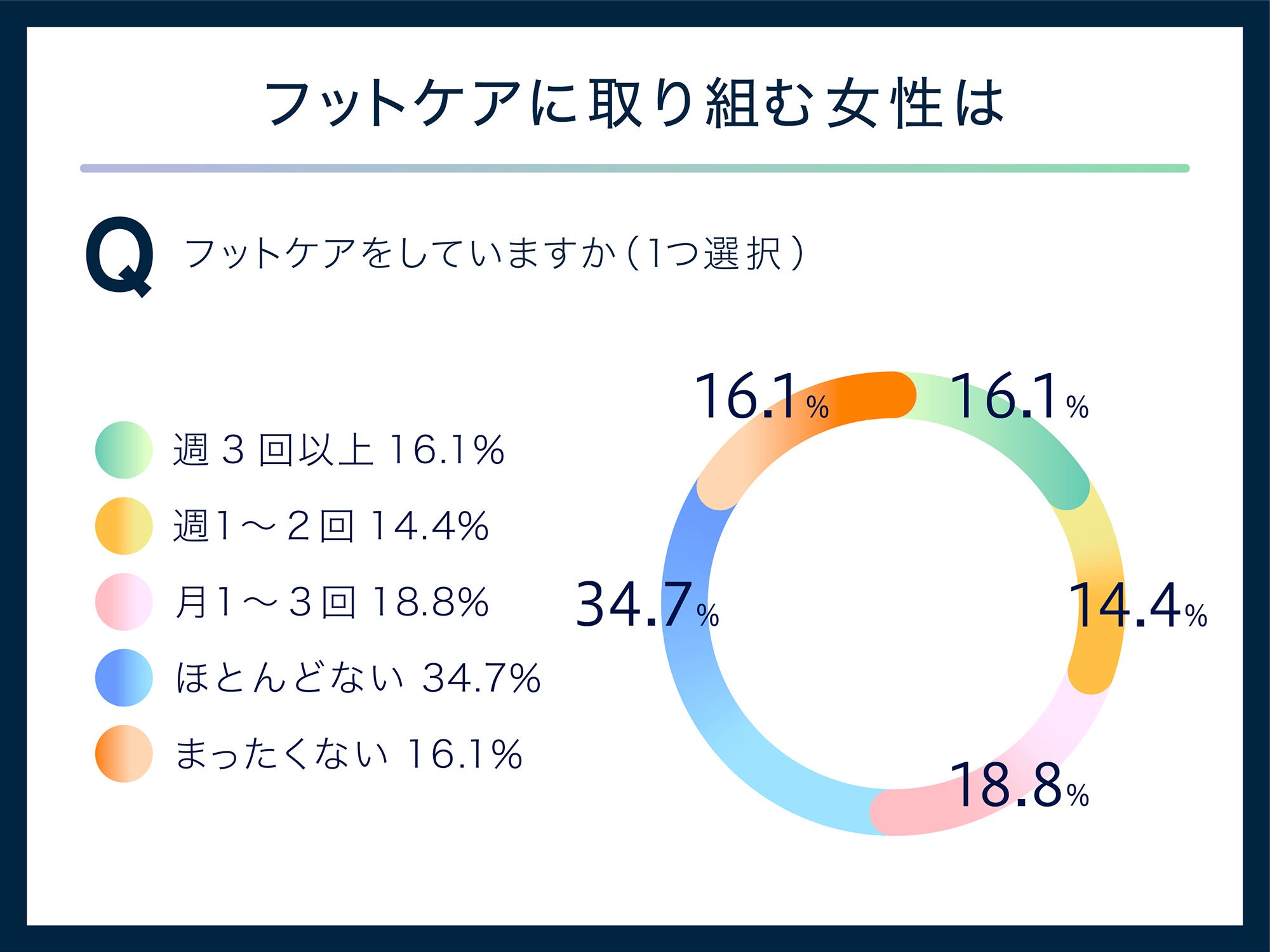 一方、足から健康を考える際、自分の足に合ったシューズ選びとともに、美容や健康維持の一環としてフットケアも重要になってきます。「フットケアをしていますか」という質問に対しては計49.3%、約2人に1人が何らかのフットケアを行っていると回答しました。