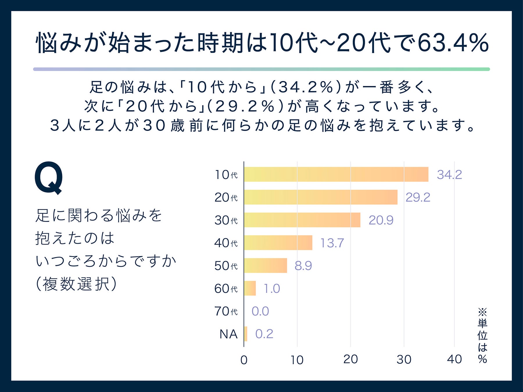 「足に関わる悩みを持っていますか」という質問では、95.4%の人が「持っている」と回答しました。このうち、その悩みが何歳代から始まったのかを質問したところ、63.4%の人が10代や20代からでした。また、悩みの種類を質問したところ、トップ5は「足の疲れ」(42.7%)、「足に合うシューズがない」(42.2%)、「足のむくみ」(40.6%)、「足の冷え」(39.5%)、「足の形」(38.9%)でした。
