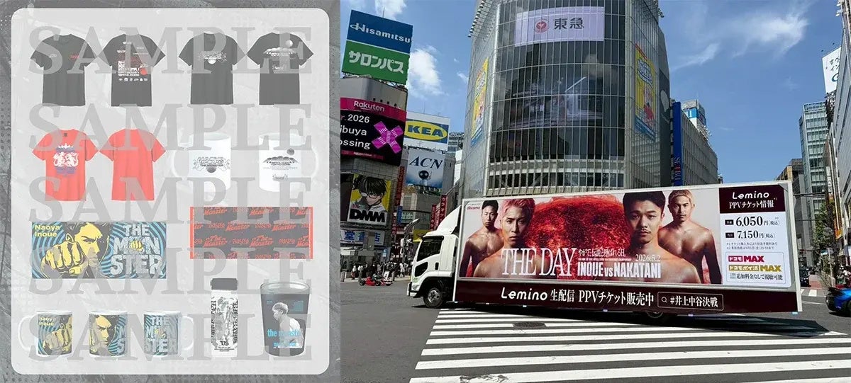 株式会社NTTドコモ(以下、ドコモ)が運営する映像配信サービス「Lemino®」は、2026年5月2日(土)に東京ドームで開催される「NTTドコモ presents Lemino BOXING ダブル世界タイトルマッチ 井上尚弥 vs 中谷潤人」(以下、本イベント)に向け、2026年4月26日(日)より全国主要都市で走行中の本イベント特別仕様アドトラックを撮影し、「#井上中谷決戦」のハッシュタグを付けてXで投稿いただくと、抽選で35名様に3万円相当のTHE DAYオフィシャルグッズセットをプレゼントするキャンペーンを2026年4月28日(火)正午から2026年5月2日(土)17:00まで実施中です。