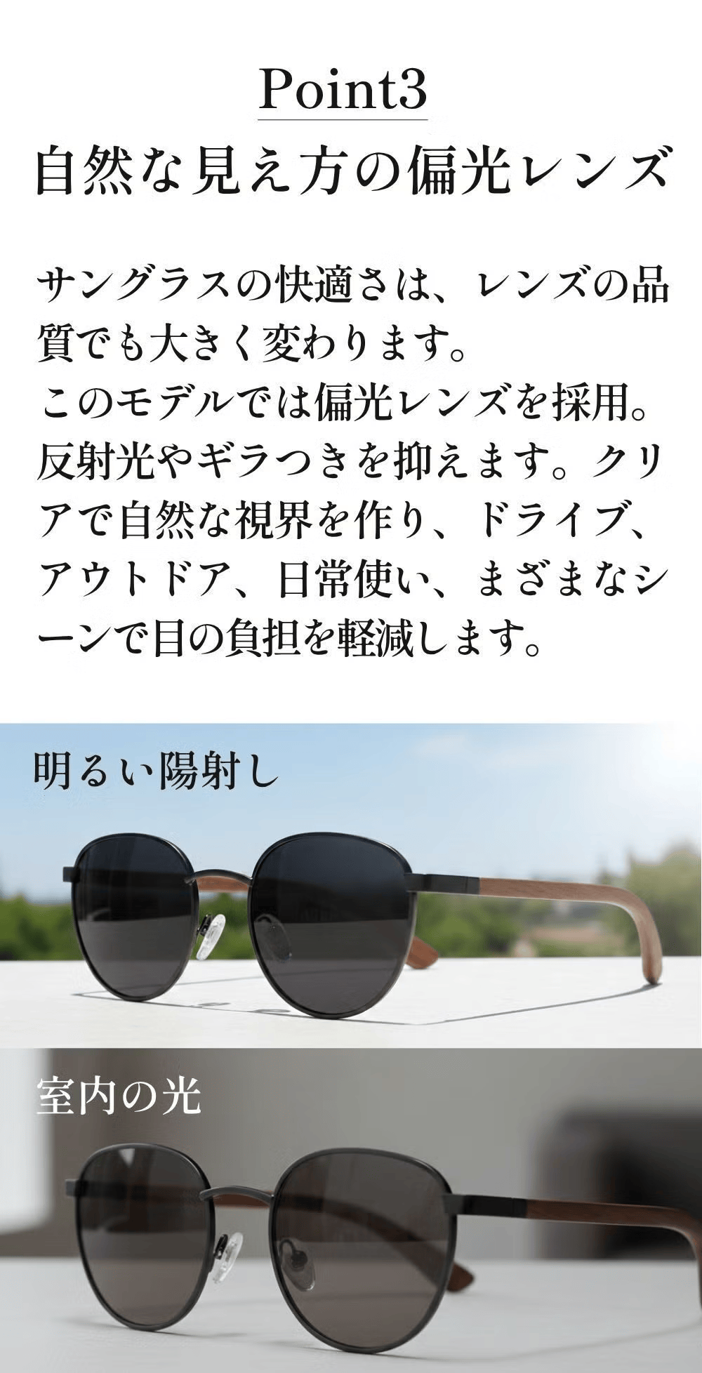 単にまぶしさを軽減するだけでなく、景色や対象物をより自然に見やすく調整されています。ドライブ、アウトドア、街歩きなど、さまざまなシーンで活躍します。