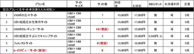 そこでこの度、1組でも多くのお客さまにご利用いただけるよう、区画の拡張を決定。自然の地形を生かし、よりワイルドなキャンプを求める方向けの「レイクビューサイト」8区画を新設するほか、少し離れた静かな自然の中で森林浴をお楽しみいただける人気の「フォレストサイト」を2区画から8区画に拡張、さらに日帰り用サイトエリアとしていた区画を、8区画の宿泊用レギュラーサイトに再編し、宿泊用のサイトを計22区画分追加します。