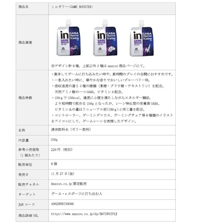 「inゼリー<GAME BOOSTER>」は、ゲームやeスポーツに没頭して楽しむ方に向けて、“ BOOST(応援する)”を意に、eスポーツのプロ選手の意見も取り入れ、シーンに特化した配合で開発したゲーミングゼリーです。長時間ゲームをする時や、集中してゲームに打ち込みたい時など、ゲームプレイ中の、特に中盤以降のエネルギー補給用として設計しました。