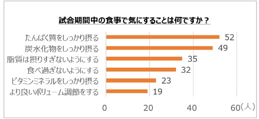 ビクトリープロジェクトがサポートをするアスリート約90名を対象に行ったアンケートによると、9割以上が「餃子が好き」と回答。一方で、餃子を試合前や当日に食べるアスリートは1割以下とほとんどおらず、その理由として、練習や試合前の食事としては「脂が多いから」という声が最も多く上げられました。アスリートにとって餃子は、「好きな食べ物」であり、コンディション調整や栄養補給といった目的を求めるメニューではありませんでした。