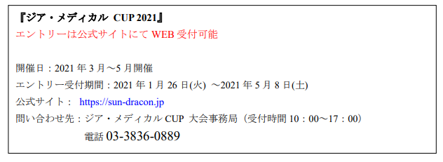令和2年12月17日付で公表しておりました当社主催による『ジア・メディカルCUP 2021』の開催につきまして、令和3年1月26日よりエントリー受付を開始いたしました。
