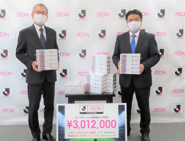 感染症拡大により大きな影響を受けている「Jリーグ」を応援する取り組みとして2020年9月、第1弾として発売した「Jリーグティッシュ」の売上金の一部である301万2,000円をJリーグに贈呈しました。また第2弾として発売した「Jリーグティッシュ」「Jリーグキッチンタオル」の売上金の一部である176万9,640円を、今年1月にJリーグに贈呈しました。贈呈金はJリーグの選手育成や環境整備等に役立てていただきます。