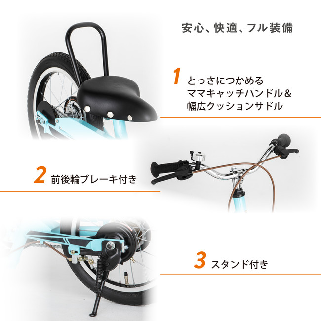 もちろん、自転車として必要不可欠な装備もきちんと備わっています。前後輪ブレーキに、スタンド。それから、大人がとっさに掴むことができる「ママキャッチハンドル」も装備。安心してお乗りいただけます。