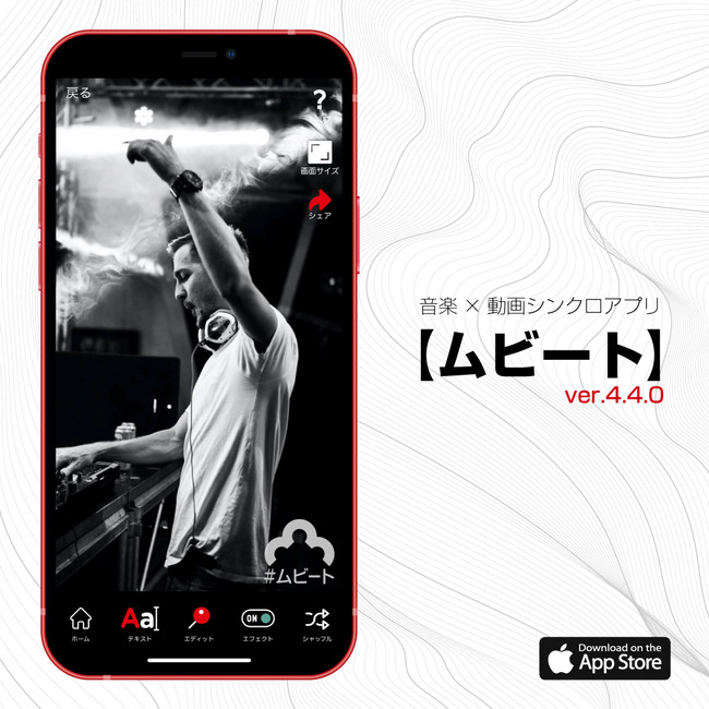 「ムビート」は、スマートフォン上でユーザーが選定した動画に好みの音楽を選んでタップすると、自動的にミュージックビデオが編集・加工できるアプリです。所要時間10秒程度で、オリジナリティある、高品質なミュージックビデオを制作することが可能です(特許出願中(特願2018-168950)。