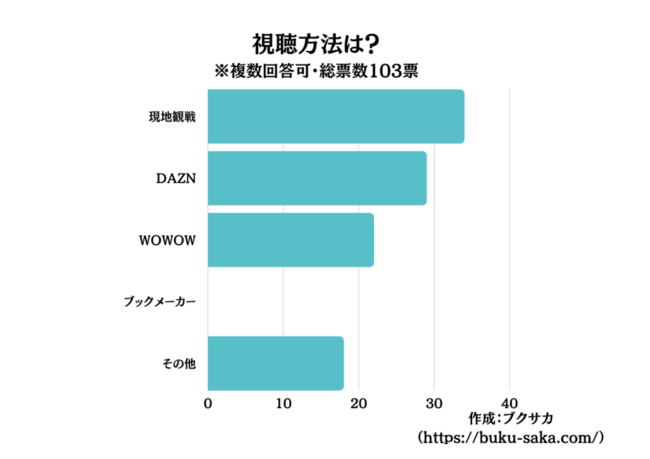 ・視聴方法は『現地観戦』が1番多く、2番目に『DAZN』、3番目に『WOWOW』が続く結果となりました。