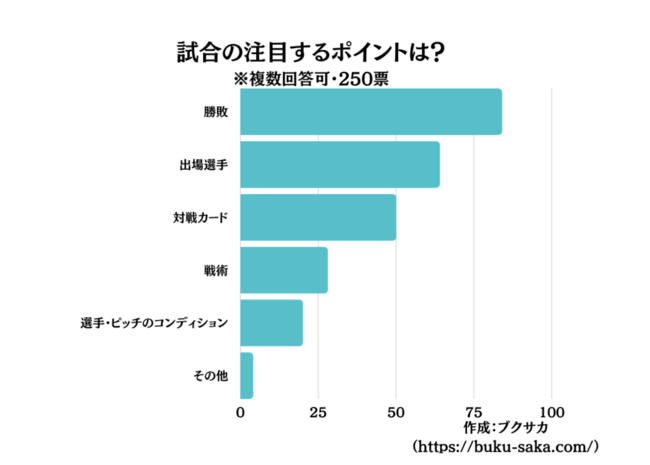 ・試合の注目するポイントで1番多かったのは『勝敗』でした。続いて、『出場選手』『対戦カード』『戦術』『選手・ピッチのコンディション』の順番でした。