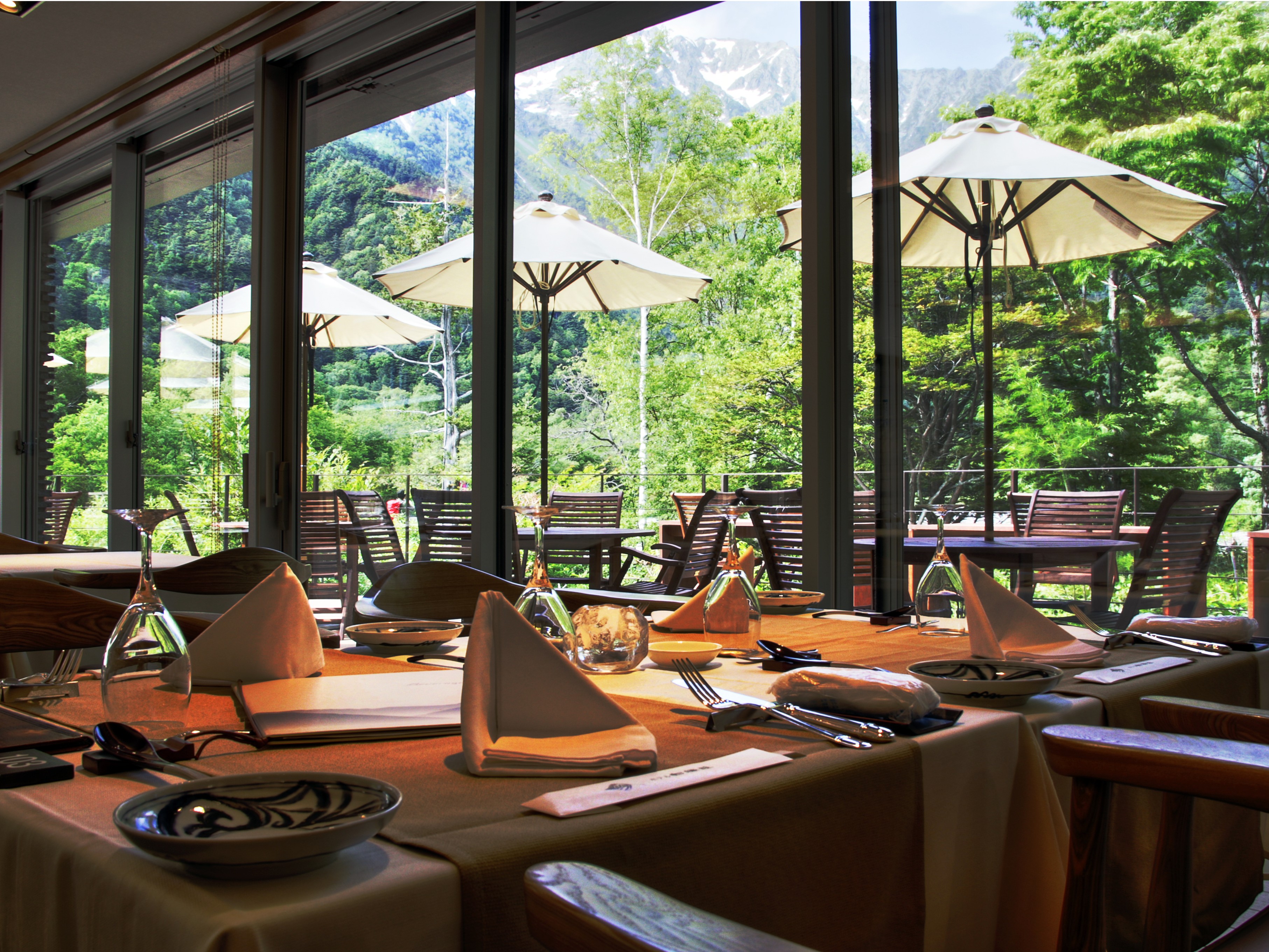 穂高連峰を望む絶景のレストランで、ホテル白樺荘スペシャルのランチバイキングを特別価格の
